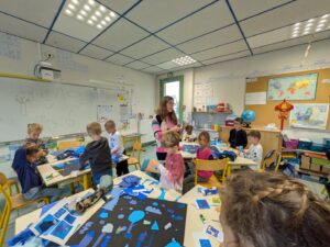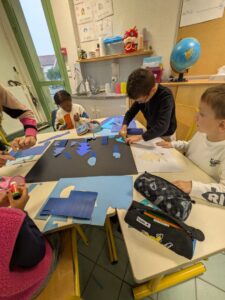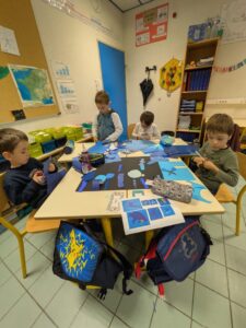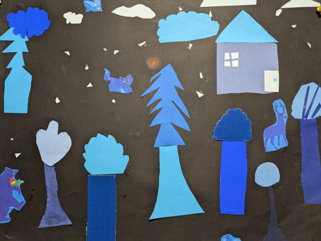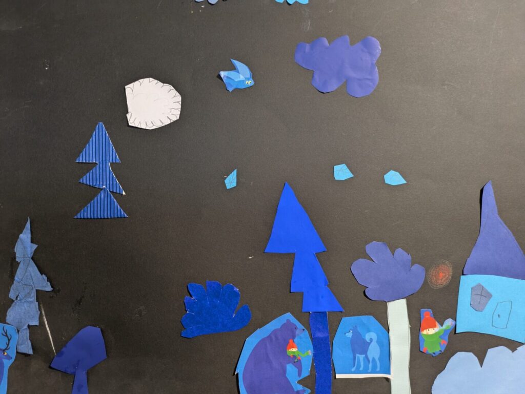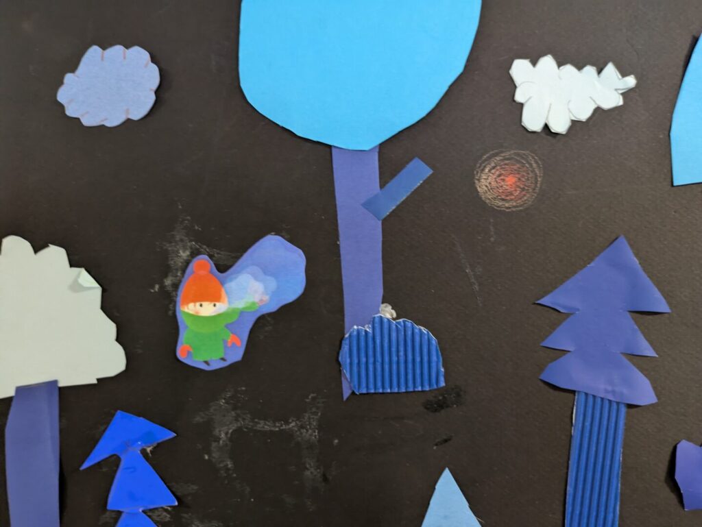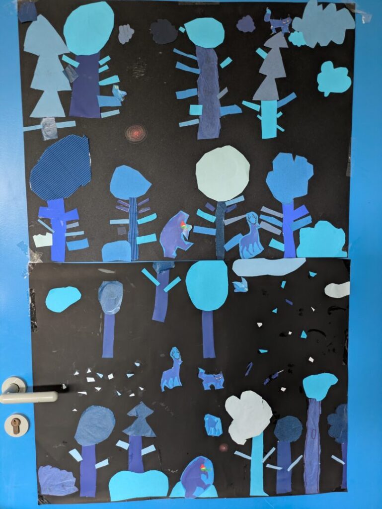 Ensuite, pour rester dans l’univers de son album, nous avons créé en groupes des forêts polaires à l’aide de papiers bleus. Nous avons enfin caché les personnages de cette histoire dans notre forêt.