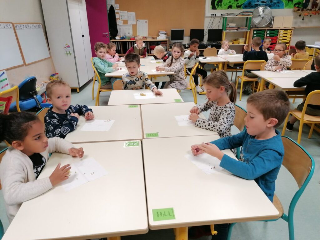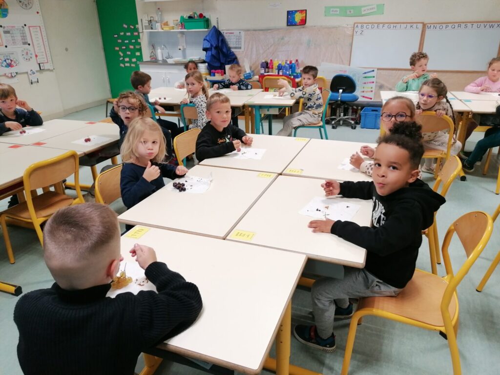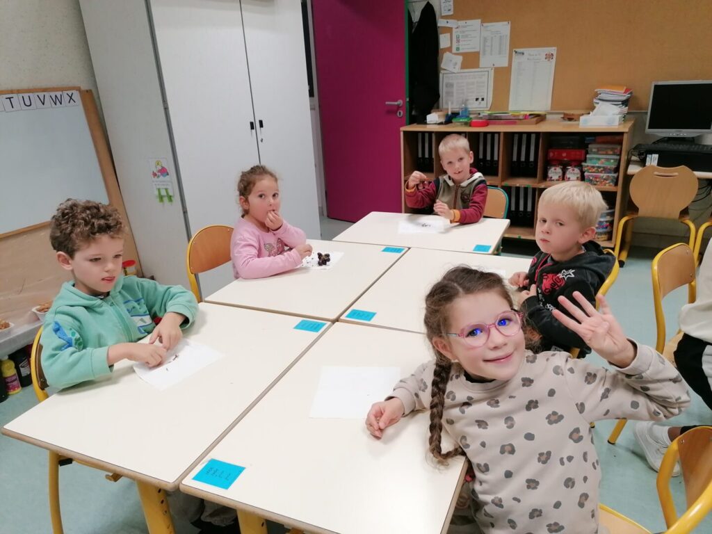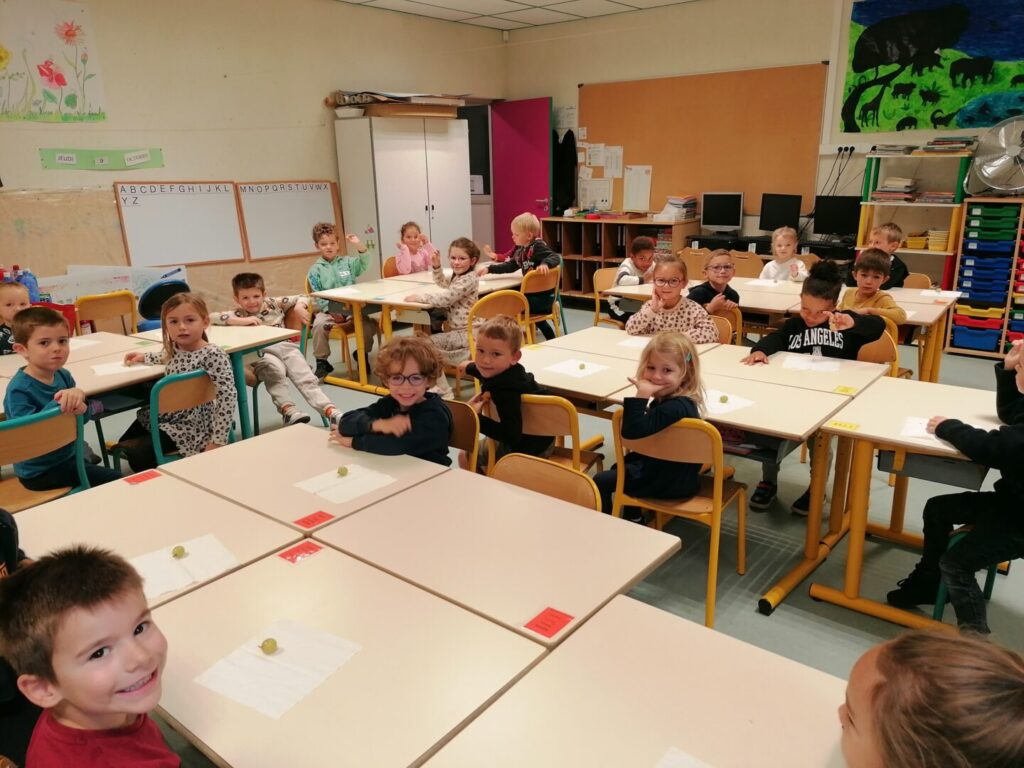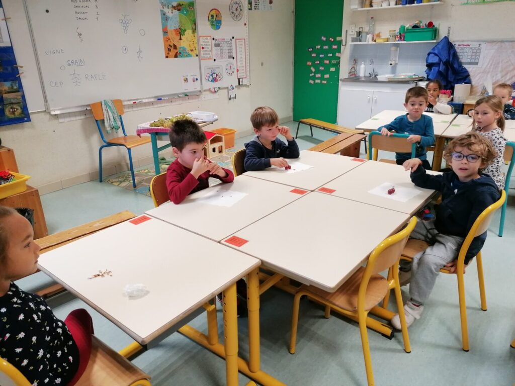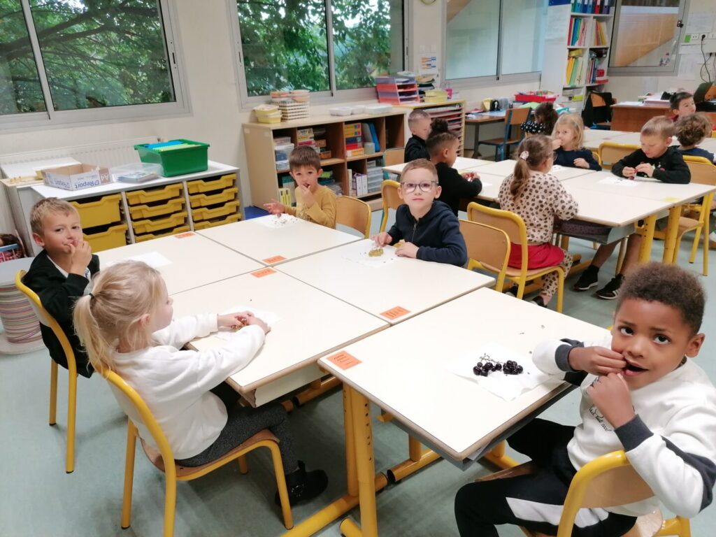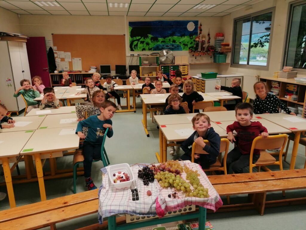 On a dessiné une grappe, un grain, un grain coupé en deux et on devait nommer ce qu’on avait représenté.  Ensuite nous avons goûté les différents raisins. Certains grains craquent quand on les mange, d’autres non. Il y en a des plus sucrés que d’autres.