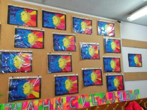 Quand je leur ai demandé comment on allait pouvoir représenter toutes ces idées, tous les enfants ont été d’accord pour partager la feuille en deux parties : nuit et jour avec les éléments clés que sont la lune et le soleil.