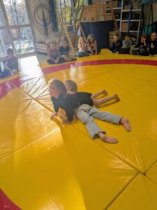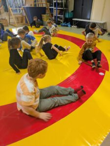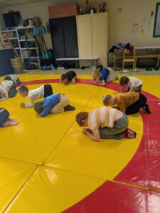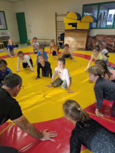 Ils apprennent à occuper l’espace du tapis sans gêner  les autres. Ils apprennent les règles : ne pas faire mal et ne pas se faire mal.