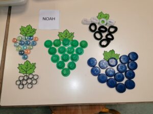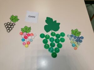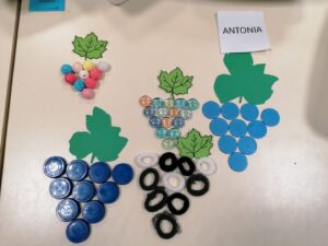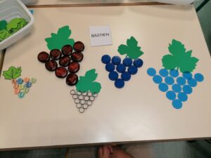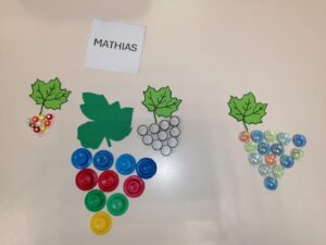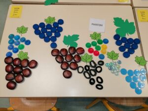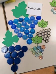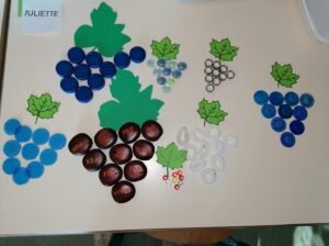 On a dessiné une grappe, un grain, un grain coupé en deux et on devait nommer ce qu’on avait représenté. Ensuite nous avons goûté les différents raisins. Certains grains craquent quand on les mange, d’autres non. Il y en a des plus sucrés que d’autres.